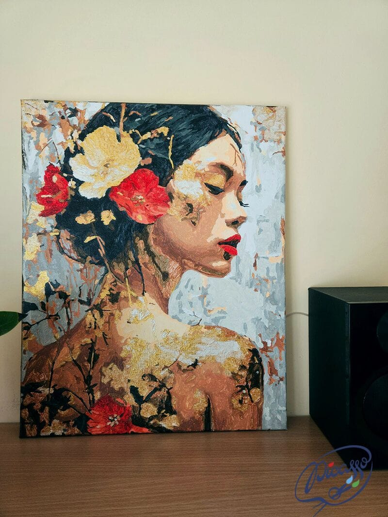 Złota farba dołączona do zestawu jest prawdziwym klejnotem tego obrazu. Jej delikatny połysk i głęboki kolor nadają konturom wyjątkowy blask, który przyciąga wzrok i sprawia, że każdy szczegół nabiera życia. To właśnie dzięki niej Bogini elegancji staje się dziełem nie tylko malarskim, ale również dekoracyjnym, które wnosi do wnętrza odrobinę luksusu i wyjątkowego charakteru.