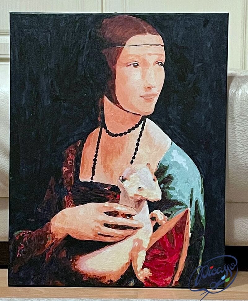 Obraz Dama z gronostajem Leonarda da Vinci to w naszym wydaniu malowanie po numerach. W zestawie nie zabraknie bardzo szczegółowej instrukcji po polsku ani specjalnego arkusza kontrolnego mającego postać powtórzonego schematu graficznego. Do kompletu dołączono także elementy do mocowania, które pozwolą na powieszenie gotowego obrazu na ścianie! Tak ekstrawagancki widok będzie doskonale prezentował się w prywatnym gabinecie, kancelarii, ale też pomieszczeniach domowych urządzonych w klasycznym stylu.