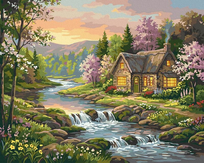 Domek w kwitnącym ogrodzie 40x50 cm malowanie po numerach