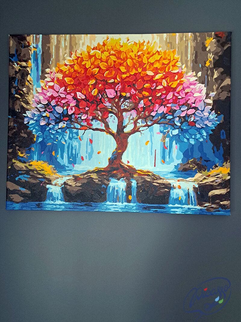 To malowanie po numerach o wymiarze nie tylko dekoracyjnym, ale i symbolicznym. Drzewo może być interpretowane jako źródło mądrości, siły lub duchowej harmonii, a jego wielobarwna korona jako obraz emocji, marzeń i przeżyć. Tło z wodospadem nadaje kompozycji dynamizmu i głębi, kontrastując z organiczną formą drzewa. Malując ten obraz, tworzysz coś wyjątkowego, połączenie natury i wyobraźni w jednym płótnie.