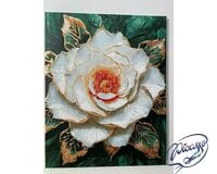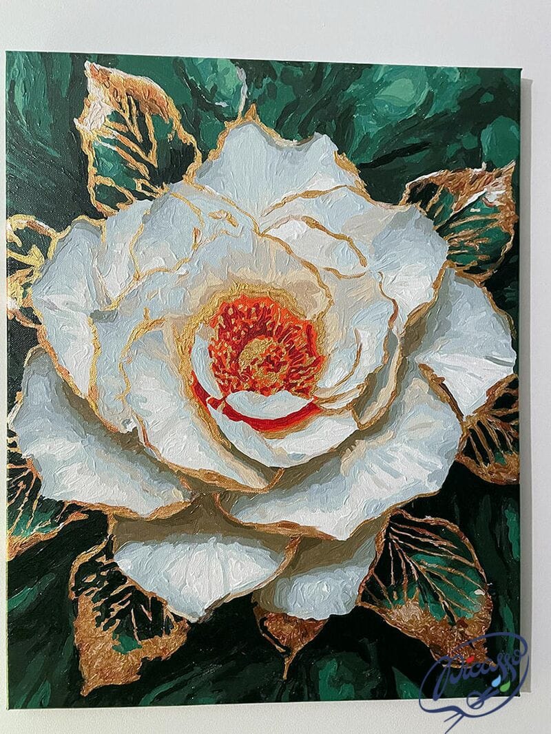 Aksamitne płatki róży zdają się niemal trójwymiarowe, a złote kontury nadają im szlachetnego blasku. To nie tylko obraz, lecz poetycka opowieść zamknięta w formacie 40x50 cm. Każde pociągnięcie pędzla to jak wers utworu pisany kolorem i światłem. Metaliczna złota farba w detalach liści i konturach nadaje dziełu luksusowego charakteru i wyjątkowej głębi.