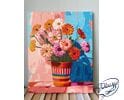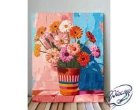 "Letnie gerbery" to obraz pełen radości i optymizmu, który przenosi nas w ciepły, słoneczny dzień, gdzie każdy kwiat zdaje się śpiewać swoją własną melodię szczęścia. Kolorowe gerbery, ustawione w pasiastej doniczce, tworzą żywiołową symfonię barw, która natychmiast przyciąga uwagę i wywołuje uśmiech na twarzy.