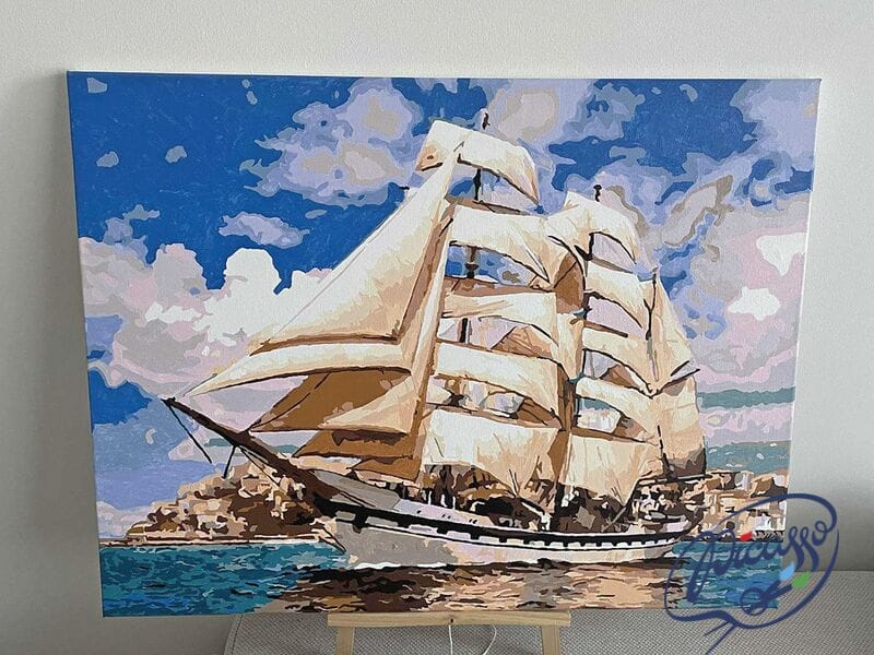 Oferujemy obraz przedstawiający morski krajobraz, a tak naprawdę oferujemy produkty, dzięki którym będzie w stanie sam go stworzyć. Z wykorzystaniem zagruntowanego płótna, zestawu 28 farb i pędzli namalujesz piękny obraz - Na pełnych żaglach. Zabawa polega na tym, aby w ponumerowanych polach nanieść odpowiednią barwę. Otrzymasz od nas również instrukcję, w której wszystkie etapy są dokładnie wyjaśnione.