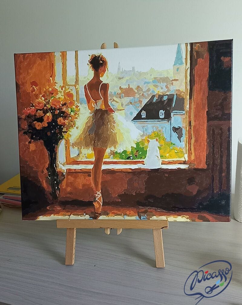 Okno marzeń to obraz do malowania po numerach, który emanuje ciszą, subtelnością i delikatnym napięciem oczekiwania. W białej sukni baletnicy i kociej sylwetce ukrywa się poetycka symetria – dwie dusze patrzące przez to samo okno, być może w tę samą stronę, może w zupełnie inne światy.
