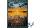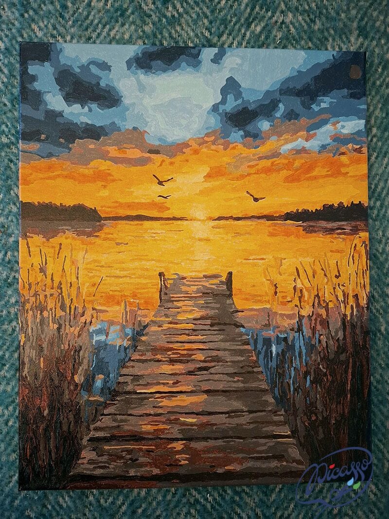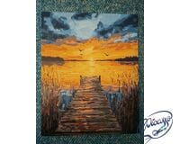 Obraz Pomost marzeń ukazuje urokliwy drewniany pomost rozciągający się nad spokojnym jeziorem, prowadzący wzrok widza ku ciepłym, złotym barwom zachodzącego słońca. Ta scena emanuje ciszą, harmonią i zaprasza do chwili refleksji oraz wyciszenia, przenosząc w świat marzeń i spokoju.