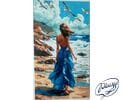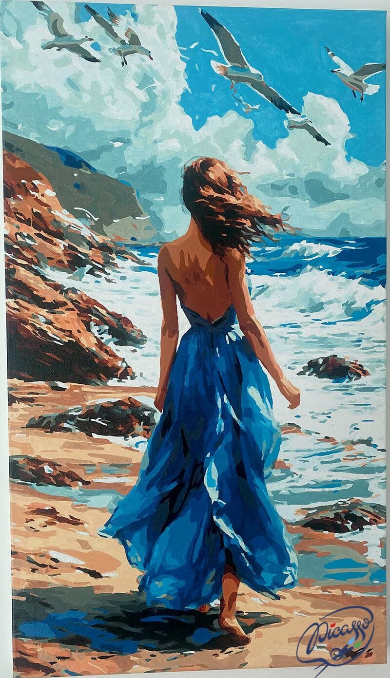 Powiew morza to obraz pełen lekkości, ruchu i świeżości. Dynamiczne linie kompozycji i miękkie, harmonijne kolory oddają delikatny wiatr niosący zapach soli, szum fal oraz śpiew mew nad brzegiem morza. Centralnym punktem obrazu jest kobieta stojąca tyłem do widza, ubrana w piękną, niebieską sukienkę, wpatrzona w spokojne, rozległe morze. Cała scena przywodzi na myśl chwilę pełną spokoju, refleksji i kontaktu z naturą, inspirowaną morską bryzą i nadmorskim klimatem.