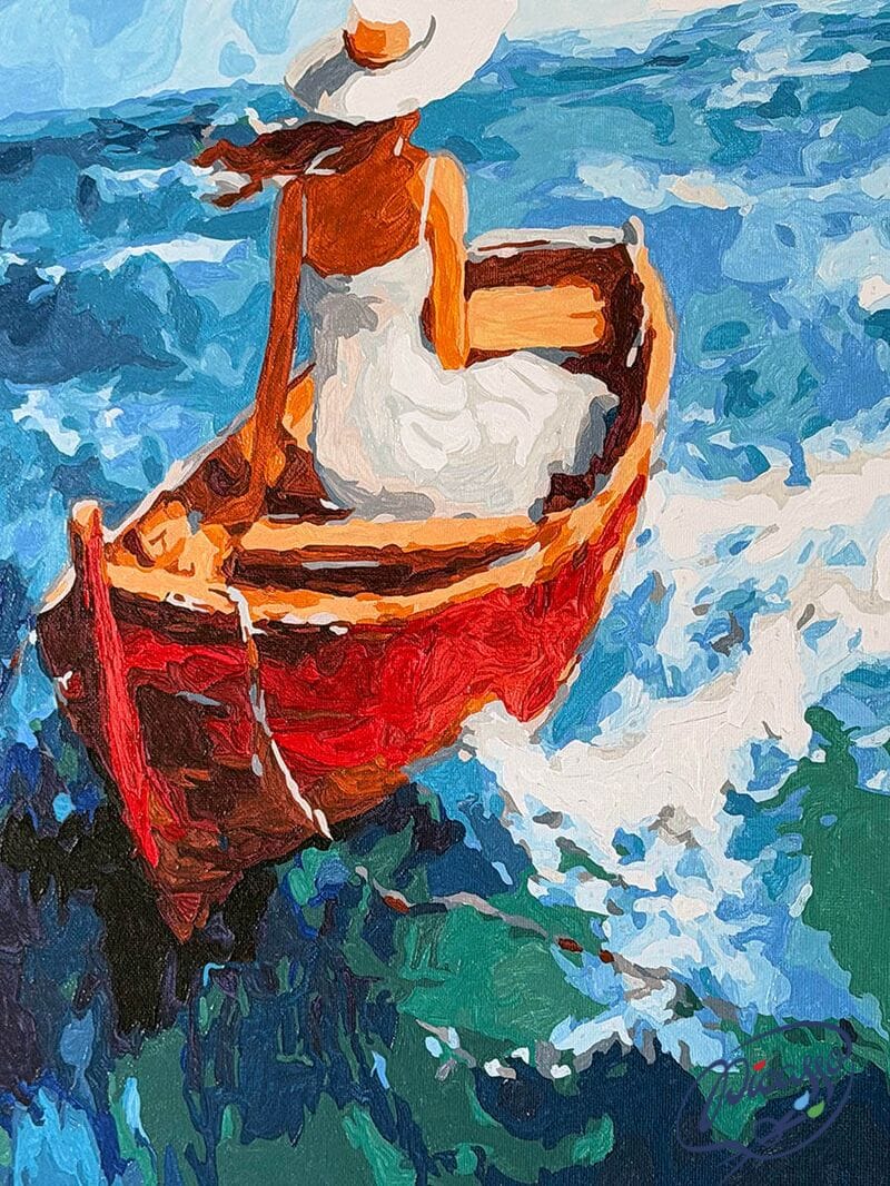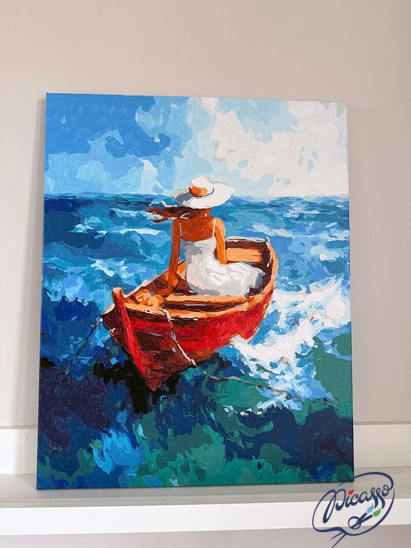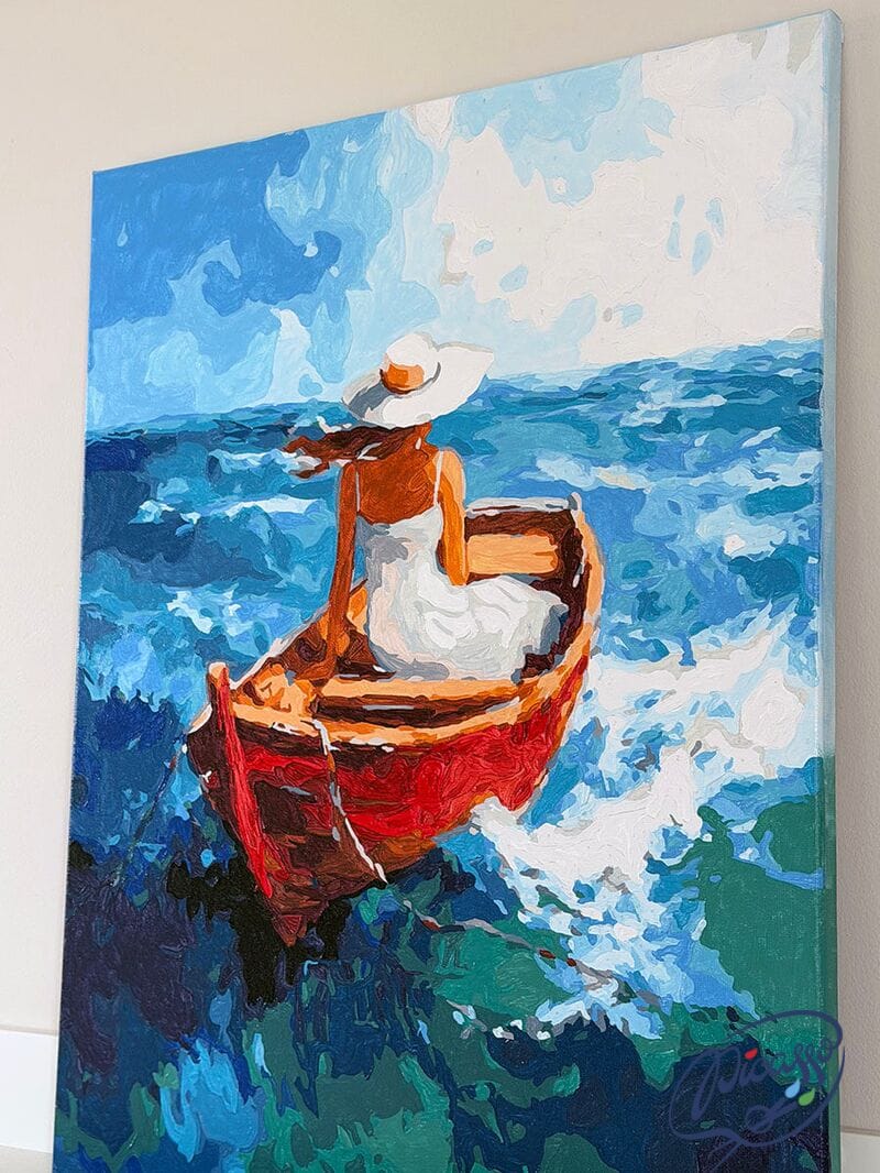 Samotność niesie dalej to obraz do malowania po numerach, który opowiada historię odważnej podróży – tej widocznej i tej, którą każdy nosi w sobie. Kobieta samotnie płynąca czerwoną łodzią po bezkresnym morzu, otulona światłem i spokojem, symbolizuje wolność, niezależność i gotowość, by podążać własną drogą – nawet jeśli prowadzi ona w nieznane.