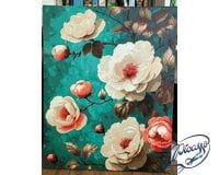 "Symfonia kwiatów" to obraz, który emanuje subtelnym urokiem i elegancją, wprowadzając nas w świat, gdzie natura śpiewa swoją najpiękniejszą melodię. Główne role w tej harmonijnej kompozycji odgrywają delikatne kwiaty w odcieniach kremowej bieli i łagodnej pomarańczy, które rozwijają się na tle głębokiego, turkusowego nieba. Każdy płatek, precyzyjnie oddany, zdaje się tańczyć w rytm niewidzialnej muzyki, tworząc atmosferę spokoju i wyrafinowania.