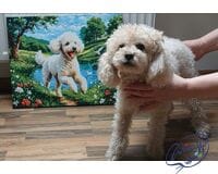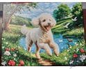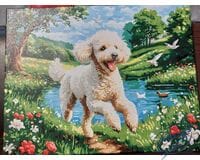 Kompozycja obrazu zachwyca naturalną kolorystyką: świeża zieleń traw, błękit wody, delikatna zieleń drzew i biel pudla tworzą harmonijną całość. Dynamiczna poza biegnącego psa wnosi do obrazu ruch, energię i dziecięcy entuzjazm. Malowanie po numerach tej sceny to nie tylko kreatywna rozrywka, to sposób na odzyskanie kontaktu z prostą radością życia i pięknem codziennych momentów.