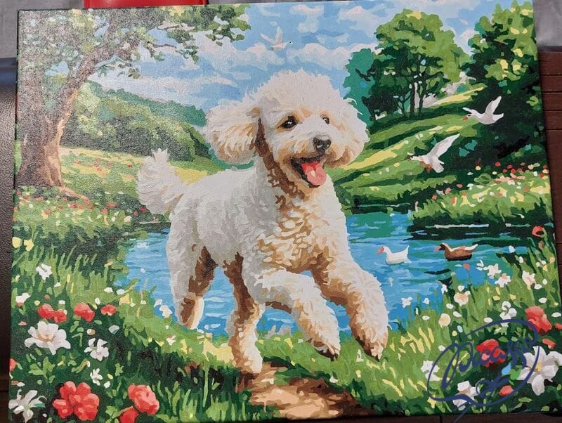 W biegu za szczęściem to obraz do malowania po numerach, który emanuje radością, swobodą i beztroską. Przedstawia białego pudla biegnącego po zielonej łące, z błyszczącym jeziorkiem i spokojnym lasem w tle. Ta pełna życia scena uchwyca jedną z tych chwil, które wydają się nieskończenie lekkie i wolne – chwilę, w której wszystko jest możliwe, a szczęście ma cztery łapy i puszyste uszy.