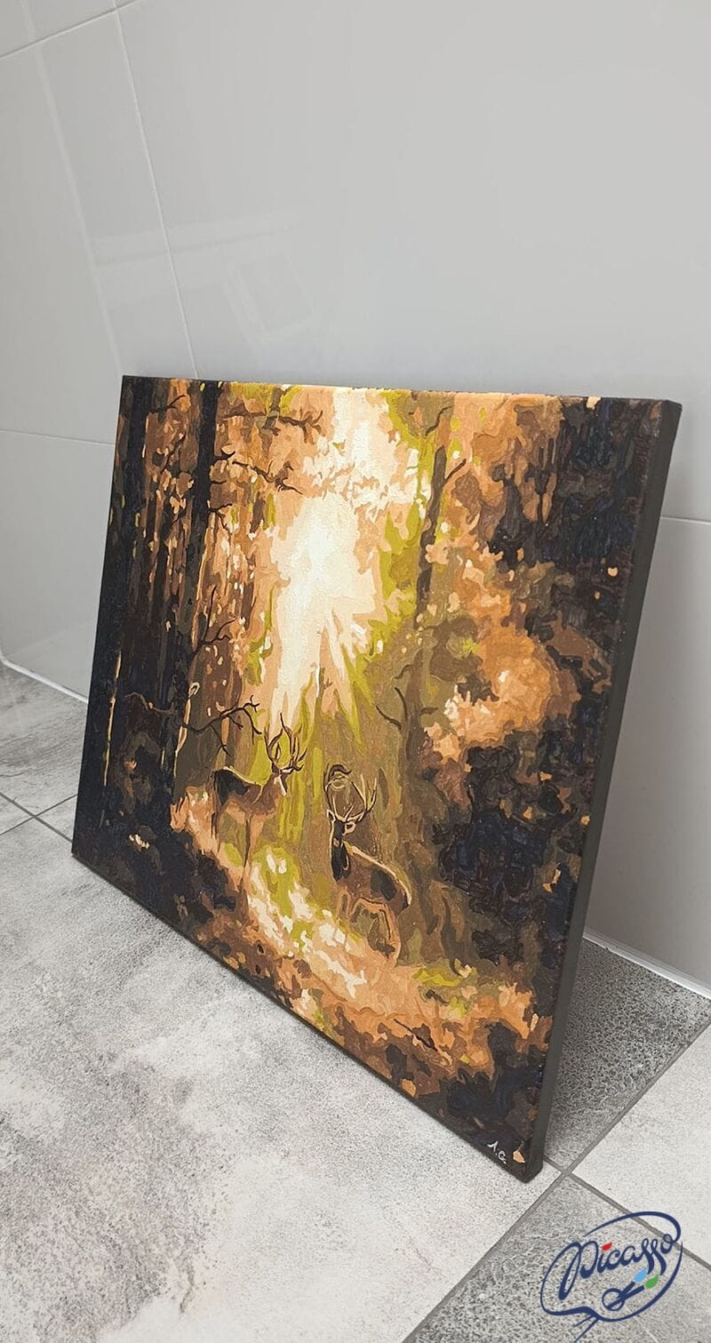 Na pierwszym planie widzimy jelenie, które jakby odprawiały swój wieczorny rytuał. Są to majestatyczne istoty, które w ciszy lasu komunikują się za pomocą niewidocznych dla nas znaków. Ich poroża, wyciągnięte ku niebu, zdają się niemymi świadkami niezliczonych historii, które kryje las. W tle, między drzewami, można dostrzec cienie innych mieszkańców tego zacisznego zakątka, skrytych w półmroku, obserwujących świat z ukrycia.