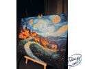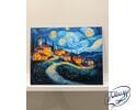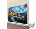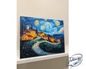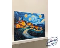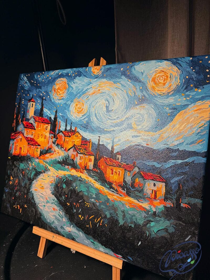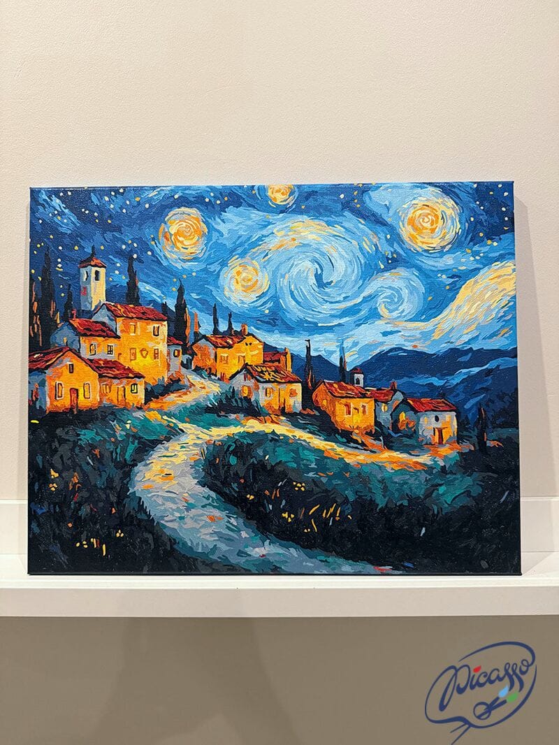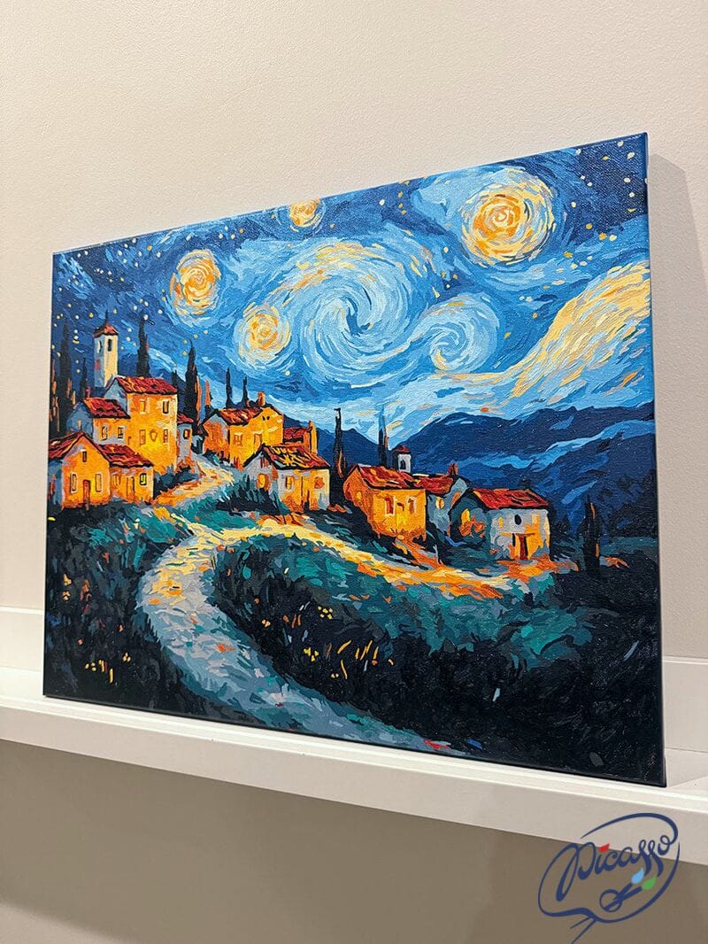 Wioska we śnie gwiazd to obraz do malowania po numerach, który przenosi Cię do świata sennych pejzaży i nocnych cudów. Urokliwa wioska, złożona z kilku domków i wijącej się drogi, zatopiona jest w nastrojowej ciszy nocy. Nad nią rozpościera się niebo w stylu Vincenta van Gogha – pełne wirujących gwiazd, pulsujących świateł i hipnotyzujących spiral. Cała scena emanuje spokojem, a jednocześnie tętni cichą energią kosmosu.
