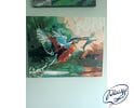 W centrum kompozycji znajduje się niezwykły łowca – zimorodek. Jego pióra lśnią w jaskrawych odcieniach błękitu i pomarańczu, odbijając światło i tworząc wrażenie, że ptak jest żywym klejnotem. Z rozpostartymi skrzydłami, unosi się nad wodą, tuż po zakończeniu swojej precyzyjnej nurkowej operacji. W jego dziobie widzimy świeżo złowioną rybę, której srebrzyste łuski połyskują w świetle.