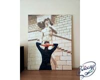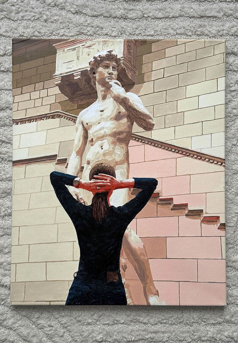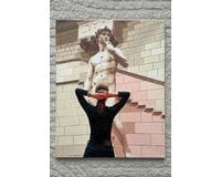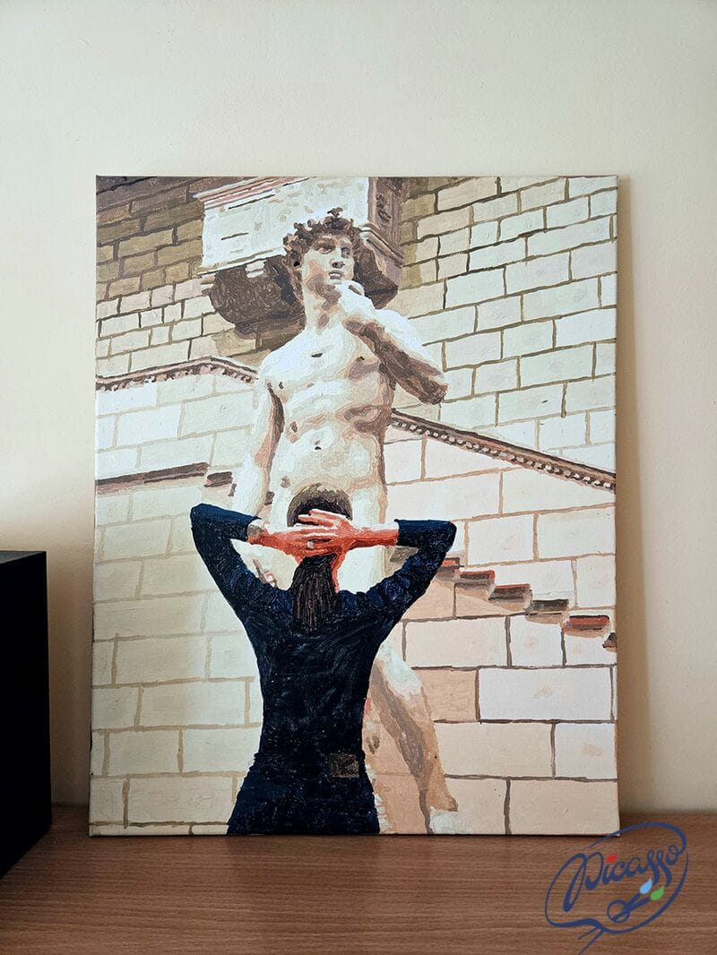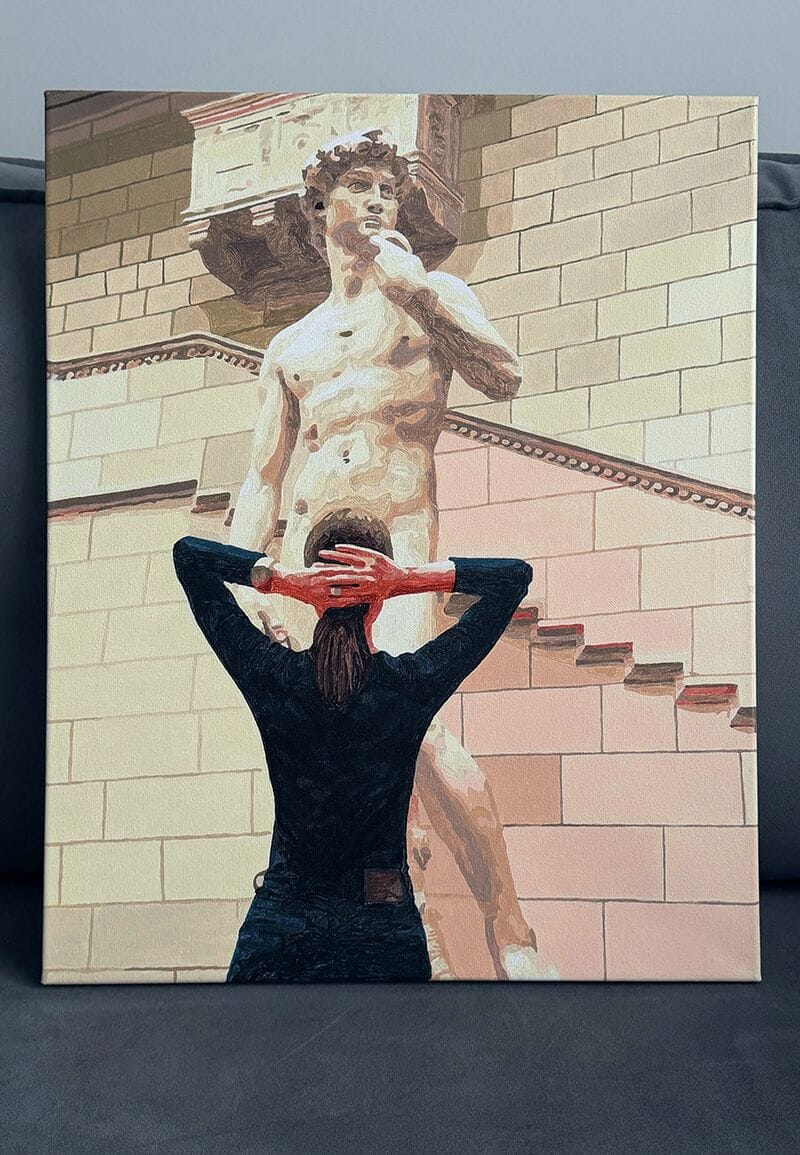 Obraz Z miłości do sztuki to nowoczesna interpretacja klasyki i współczesnej ekspresji, która łączy w sobie sztukę rzeźbiarską z kreatywną wizją młodej postaci. Przedstawia dziewczynę stojącą tyłem do widza, z delikatnym nawiązaniem do jednego z najbardziej znanych dzieł rzeźby – posągu Dawida. Jej sylwetka i układ rąk tworzą dynamiczną, niemal rzeźbiarską formę, która prowokuje do refleksji nad dialogiem między ciałem a sztuką, przeszłością a współczesnością.