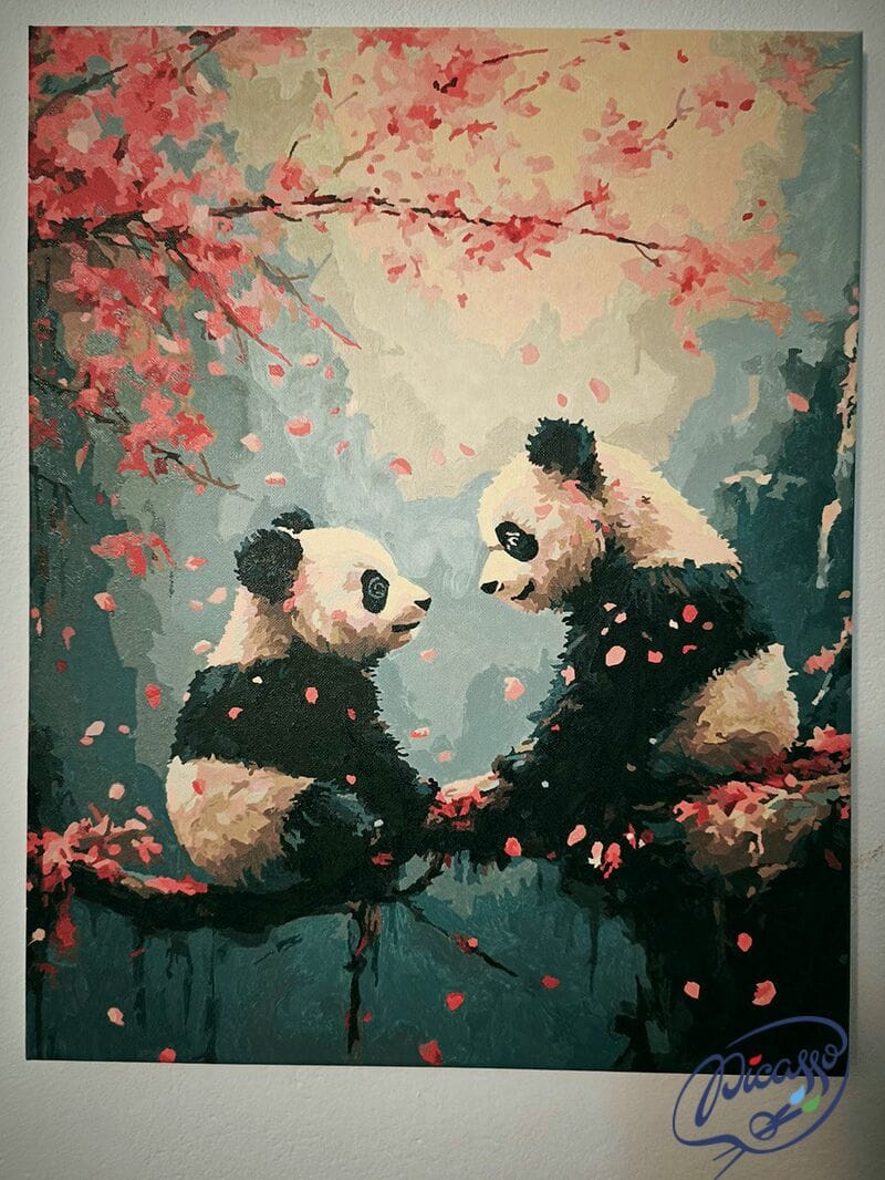 Różowe kwiaty wiśni tworzą miękką oprawę dla czarno-białych sylwetek pand, a delikatna kolorystyka obrazu działa kojąco na zmysły. To kompozycja, która zachwyca nie tylko formą, ale też nastrojem – subtelnym, pełnym ciepła i łagodności.
