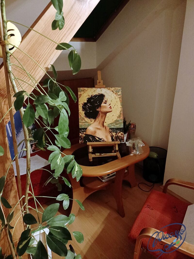 Złota farba użyta w tym obrazie odbija światło niczym zwierciadło emocji, podkreślając każdy szczegół i nadając kompozycji głębię, która zaprasza do refleksji i wyciszenia. Malowanie tej kobiecej sylwetki to nie tylko artystyczne wyzwanie, ale prawdziwa duchowa podróż, chwila, gdy pędzel staje się narzędziem wyrażania tego, co niewidoczne dla oczu, lecz wyczuwalne sercem.