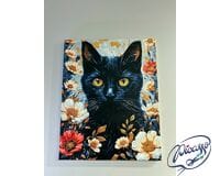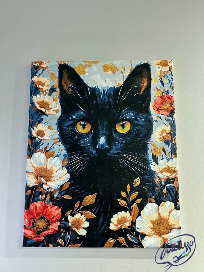 Kota otaczają delikatne kwiaty, które wzmacniają atmosferę łagodności i harmonii. Całość dopełniają złote akcenty, ręcznie nanoszona złota farba sprawia, że sierść i otoczenie zyskują subtelny, szlachetny blask. Światło odbija się od detali, nadając obrazowi trójwymiarowości i wyjątkowego charakteru. Każdy ruch pędzla staje się chwilą odprężenia, taką samą, jaką celebruje nasz mistrz.